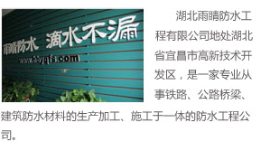 湖北雨睛防水工程有限公司地處湖北宜昌高新技術公司獲得了國家質量管理體系認證證書,也取得了湖北省建筑防水材料專業協會會員資格;并榮獲了湖北省建設廳頒發的建筑施工貳......[更多]